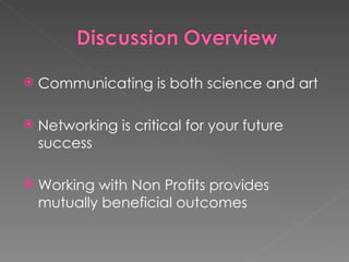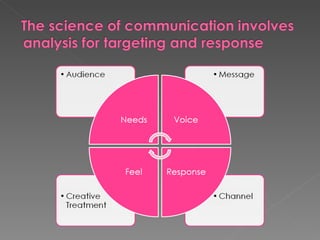 The document discusses effective communication. It notes that communication is both an art and a science. There are common misperceptions about communication, and learning to communicate effectively enables higher performance. Both speaking and listening are important, as is understanding different perspectives. Simplicity, clarity and openness are keys to good communication.