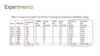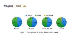 The document discusses neural network optimization techniques including pruning and quantization to reduce the number of weights and overall bits in models like AlexNet and VGG-16. It highlights research by Song Han et al. on methods like deep compression and efficient inference engines, achieving significant reductions in model size and energy consumption. The findings suggest that regularization techniques and specific quantization strategies play crucial roles in maintaining model accuracy while optimizing performance.