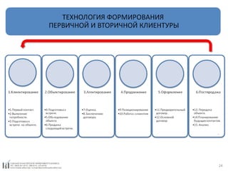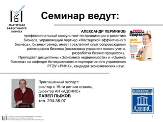 Семинар для риэлторов, проходящий 18 июня 2010 года, направлен на повышение эффективности продаж риэлторских услуг и обучение правильной организации работы с клиентами. Ведущие семинара, опытные специалисты в области недвижимости, обсудят ключевые аспекты, такие как воронка продаж, работа от продавца и покупателя, а также технологии формирования клиентской базы. Участники семинара получат знания о том, как обеспечить стабильный доход и развить долгосрочные доверительные отношения с клиентами.