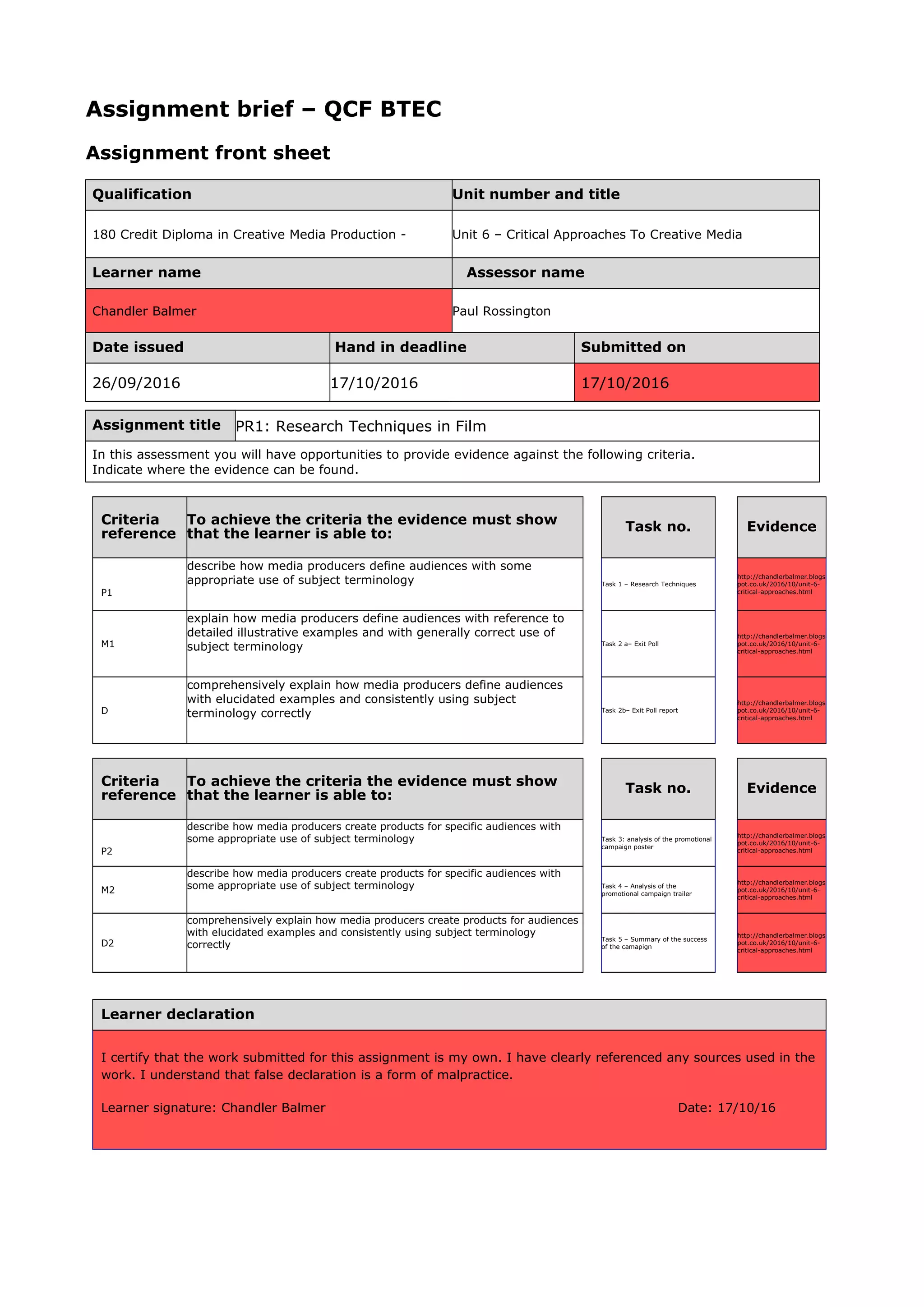This assignment brief outlines the tasks and criteria for a student to meet regarding how media producers define and create products for audiences. The student must complete 5 tasks analyzing examples like an exit poll, promotional poster and trailer, and summarizing a campaign's success. For each criteria, the brief lists the evidence required, such as using terminology and examples, and links to the student's blog where evidence will be posted. Upon completion, the student must sign a declaration that the work is their own.