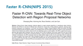 Faster R-CNN improves object detection by introducing a Region Proposal Network (RPN) that shares full-image convolutional features with the detection network, thus enabling nearly cost-free region proposals. The RPN slides over feature maps and predicts object bounds and objectness at each position. During training, anchors are assigned positive or negative labels based on Intersection over Union with ground truth boxes. Faster R-CNN runs the RPN in parallel with Fast R-CNN for detection, end-to-end in a single network and stage. This achieves state-of-the-art object detection speed and accuracy while eliminating computationally expensive selective search for proposals.