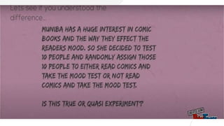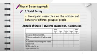 This document discusses experimental and non-experimental research methods. Experimental research involves comparing groups, such as exposing one plant to sunlight and keeping another in the dark. Non-experimental research describes data and relationships without manipulation. It can use primary, secondary, or meta-analysis of quantitative and qualitative data to understand people's views. Survey research is a type of non-experimental method that collects opinions from a sample of people to describe societies' attitudes on issues. It aims to identify conditions, problems or answer social questions efficiently and confidentially while representing large groups.