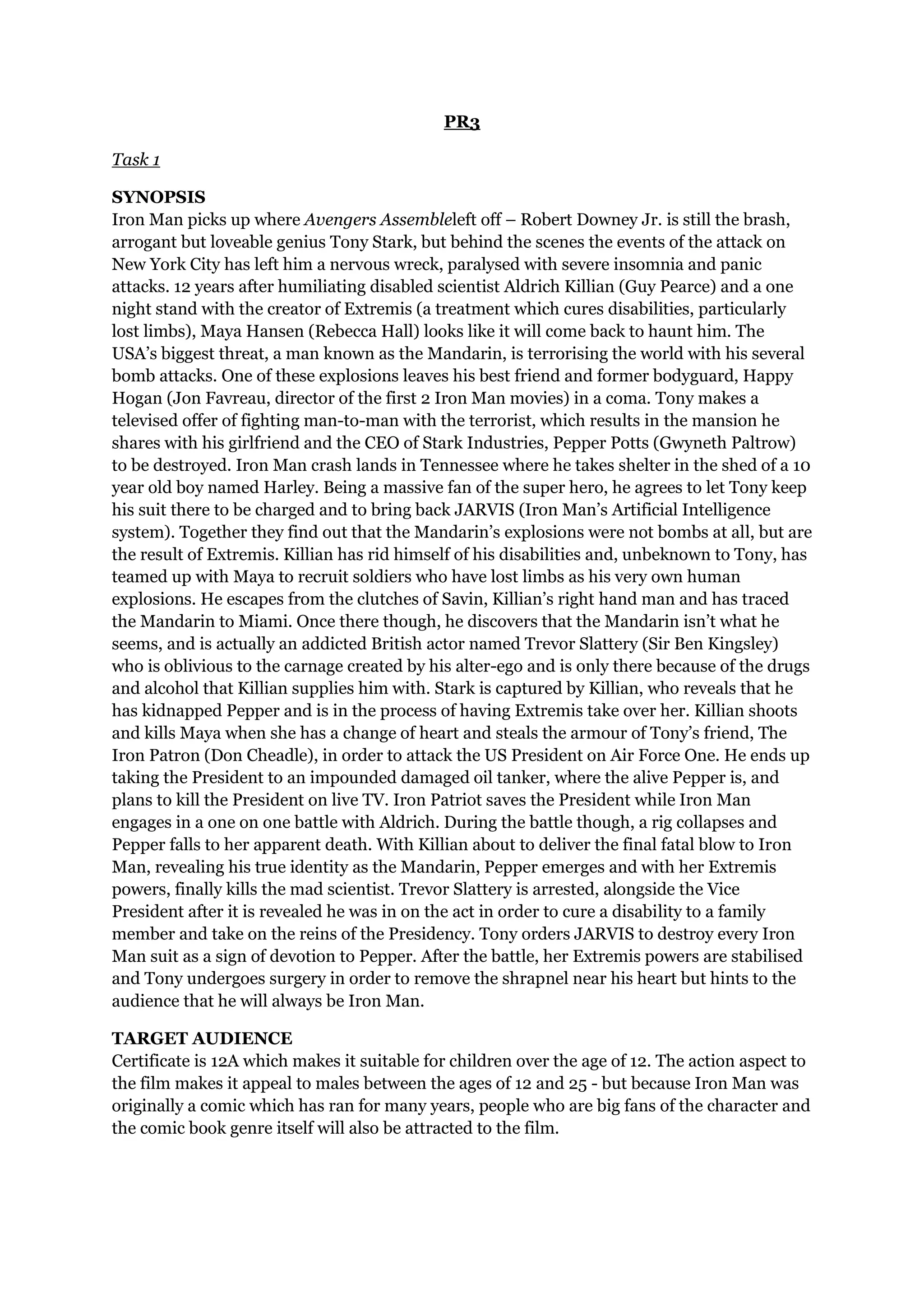 Robert Downey Jr. returns as Tony Stark/Iron Man in Iron Man 3. The film picks up after the events of The Avengers, with Tony suffering from panic attacks. He investigates terrorist attacks conducted by the Mandarin, but discovers the attacks were actually conducted by Aldrich Killian using a treatment called Extremis. Killian has kidnapped Pepper Potts and plans to kill the President on live TV. Iron Man battles Killian and his forces to rescue Pepper and save the President, defeating Killian with Pepper's new Extremis abilities. Tony decides to retire from being Iron Man but hints he may return.