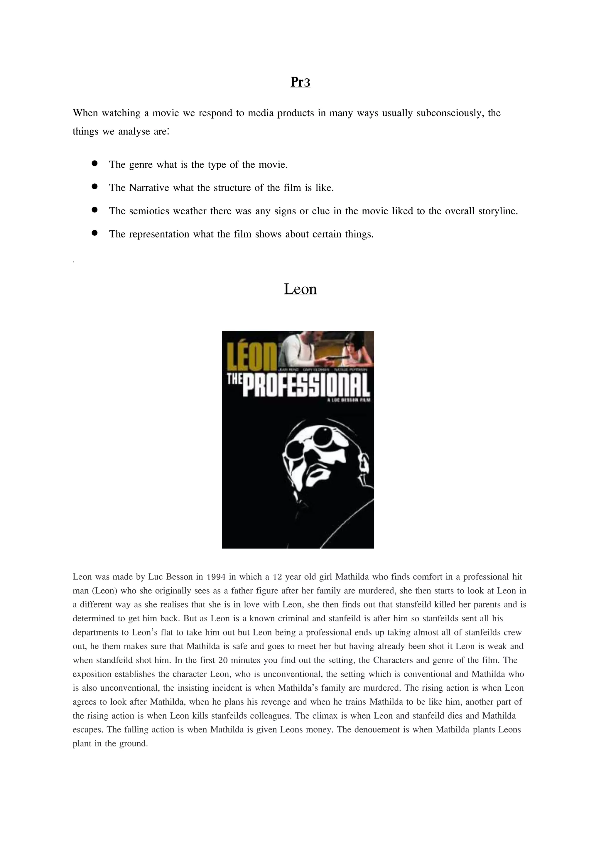 Leon is a 1994 film directed by Luc Besson about a 12-year-old girl, Mathilda, who befriends a professional hitman named Leon after her family is murdered. She sees Leon as a father figure but later develops romantic feelings for him. The film follows Mathilda seeking revenge against the man who killed her family with Leon's help, and their confrontation against corrupt DEA agent Stansfield. The narrative structure establishes the characters and setting in the first 20 minutes and includes events like Leon training Mathilda and their final showdown with Stansfield. Leon is set in the iconic location of New York City and explores unconventional representations like Mathilda's attachment to the much older Leon.
