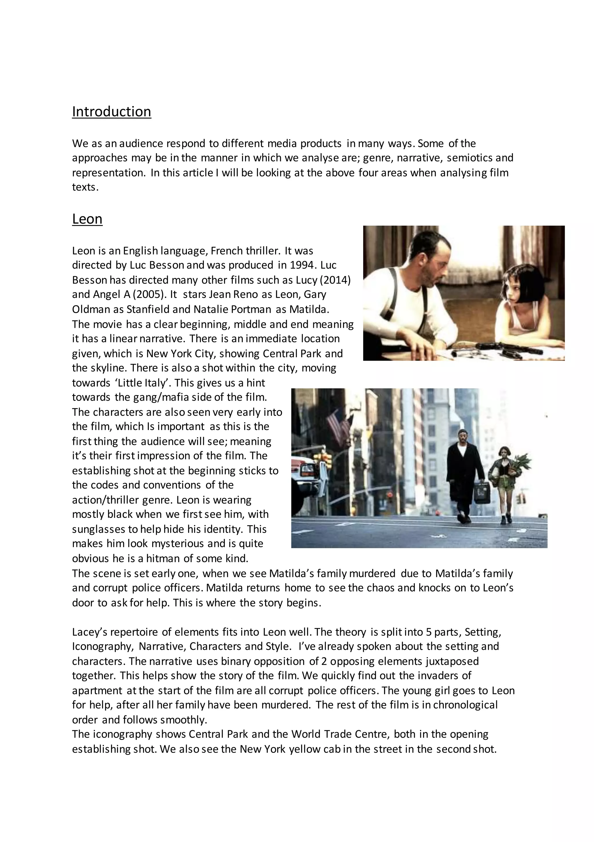 This document provides an analysis of the film Leon using concepts from film theory, including genre, narrative, semiotics, and representation. It analyzes how the film fits genres such as thriller/action and establishes characters, settings, and plot elements quickly. It discusses the film's narrative structure and use of symbols. Additional films like Pulp Fiction and Lord of the Rings are briefly analyzed using similar concepts. The document also explores how postmodernism and changes in production technology have impacted parody and pastiche in films.