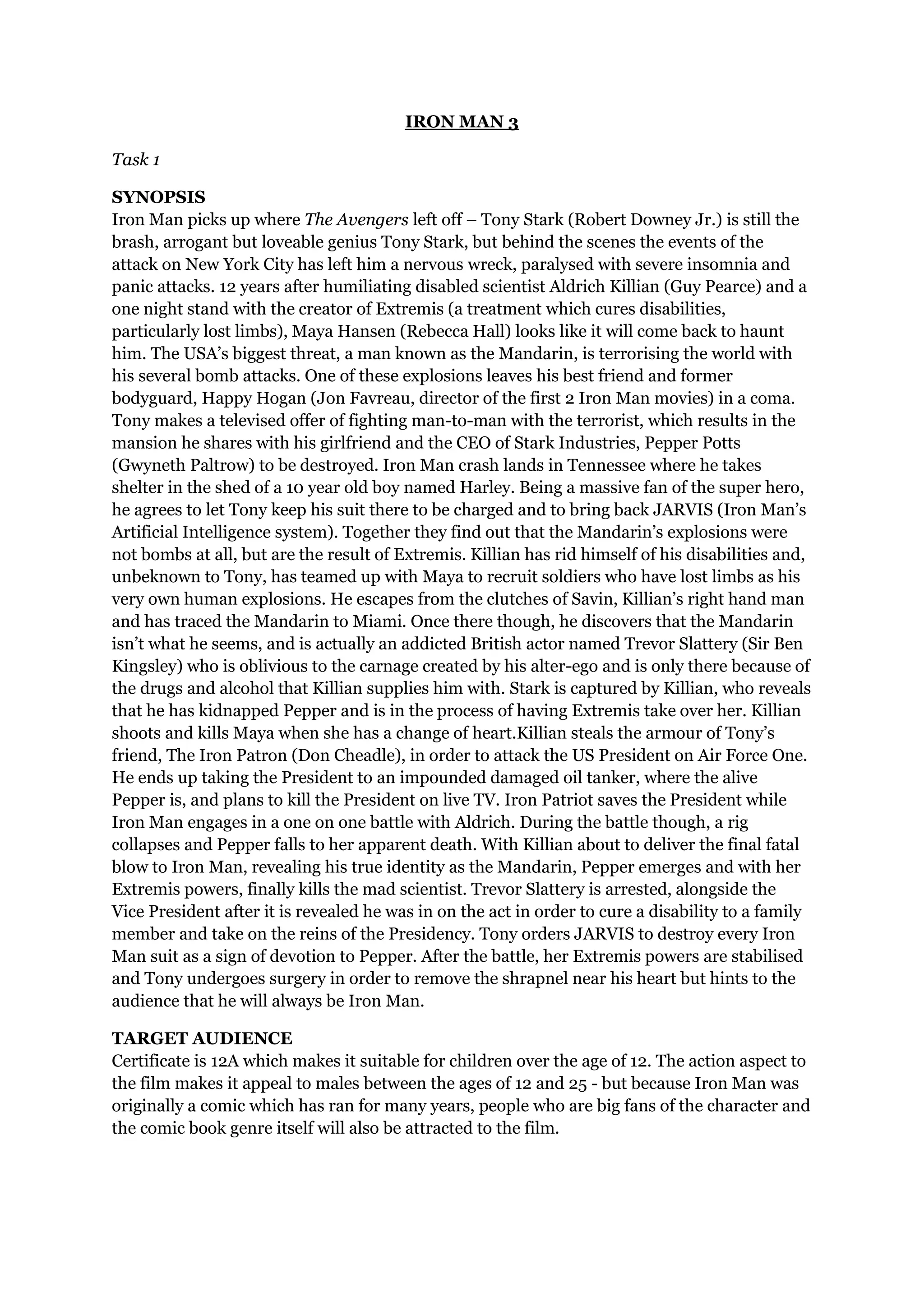 Iron Man 3 picks up after the events of The Avengers, leaving Tony Stark suffering from panic attacks. He investigates terrorist attacks by a villain known as the Mandarin, which leads him to discover an ex-scientist named Aldrich Killian is using an experimental treatment called Extremis to turn people into human bombs. Killian has also kidnapped Tony's girlfriend Pepper Potts and plans to kill the President on live television. Tony battles Killian and his enhanced soldiers. With Pepper's new Extremis powers, she is able to defeat and kill Killian, saving Tony and stopping Killian's plans.