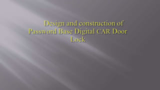 This document describes a project to develop a password-based car door lock system using an Arduino Uno microcontroller. The system uses a 4x4 keypad, LCD display, servo motor, buzzer, and other components. It is designed to open the door only when the correct password is entered, and sound the buzzer for an incorrect password. A flowchart shows the process of entering the password, validating it, and controlling the servo motor accordingly. Potential applications are discussed as well as advantages, disadvantages and future scope.