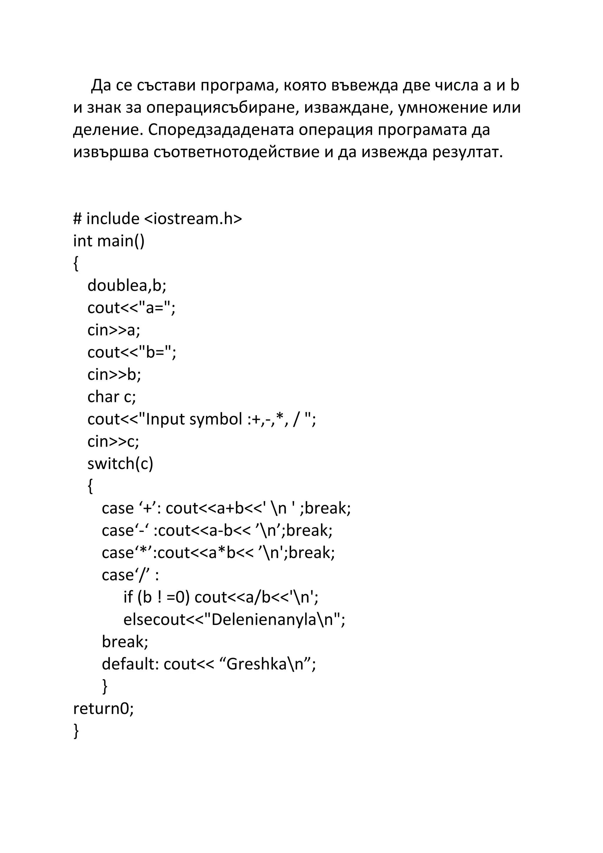 case ‘+’: cout<<a+b<<' n ' ;break;