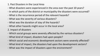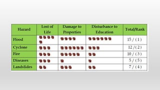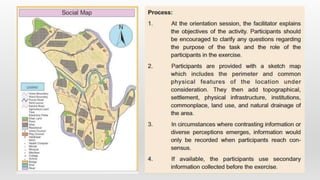 This document outlines tools and methods for participatory disaster risk assessment (PDRA) with local communities. It discusses tools such as social mapping, hazard Venn diagrams, hazard mapping, livelihood seasonal calendars, timelines, hazard and resource maps, and transect walks that can help communities identify and analyze hazards, vulnerabilities, and coping capacities. The goal is to work with communities to understand disaster impacts on people's lives and livelihoods, vulnerable groups, local resources and challenges. Matrix ranking is also described as a tool to prioritize different hazards or disaster risks according to community-defined criteria.