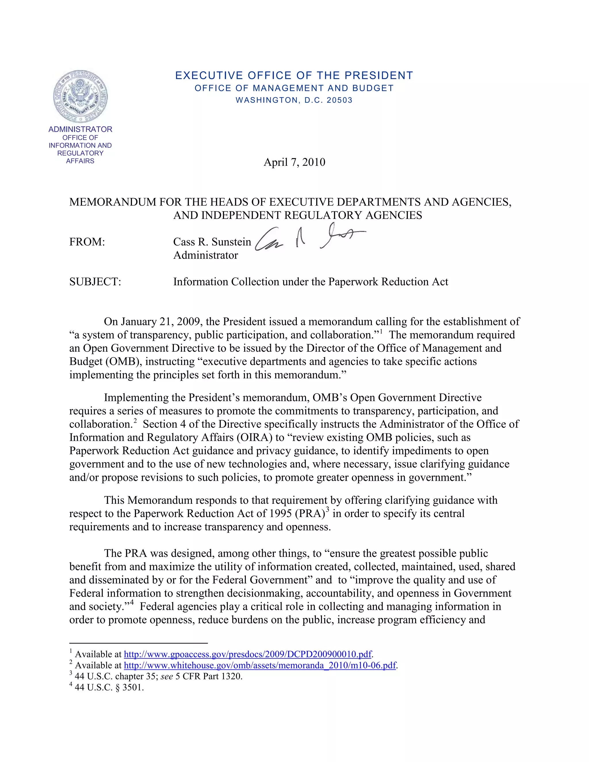 This memorandum from the Office of Management and Budget provides clarifying guidance on the Paperwork Reduction Act in order to increase transparency and openness in government information collection. It summarizes the key requirements of the Act, including that agencies must seek public comment on proposed collections and get OMB approval. It defines what types of information and collections are and are not covered by the Act. The goal is to specify the central requirements of the Act and clarify policies to promote greater openness.