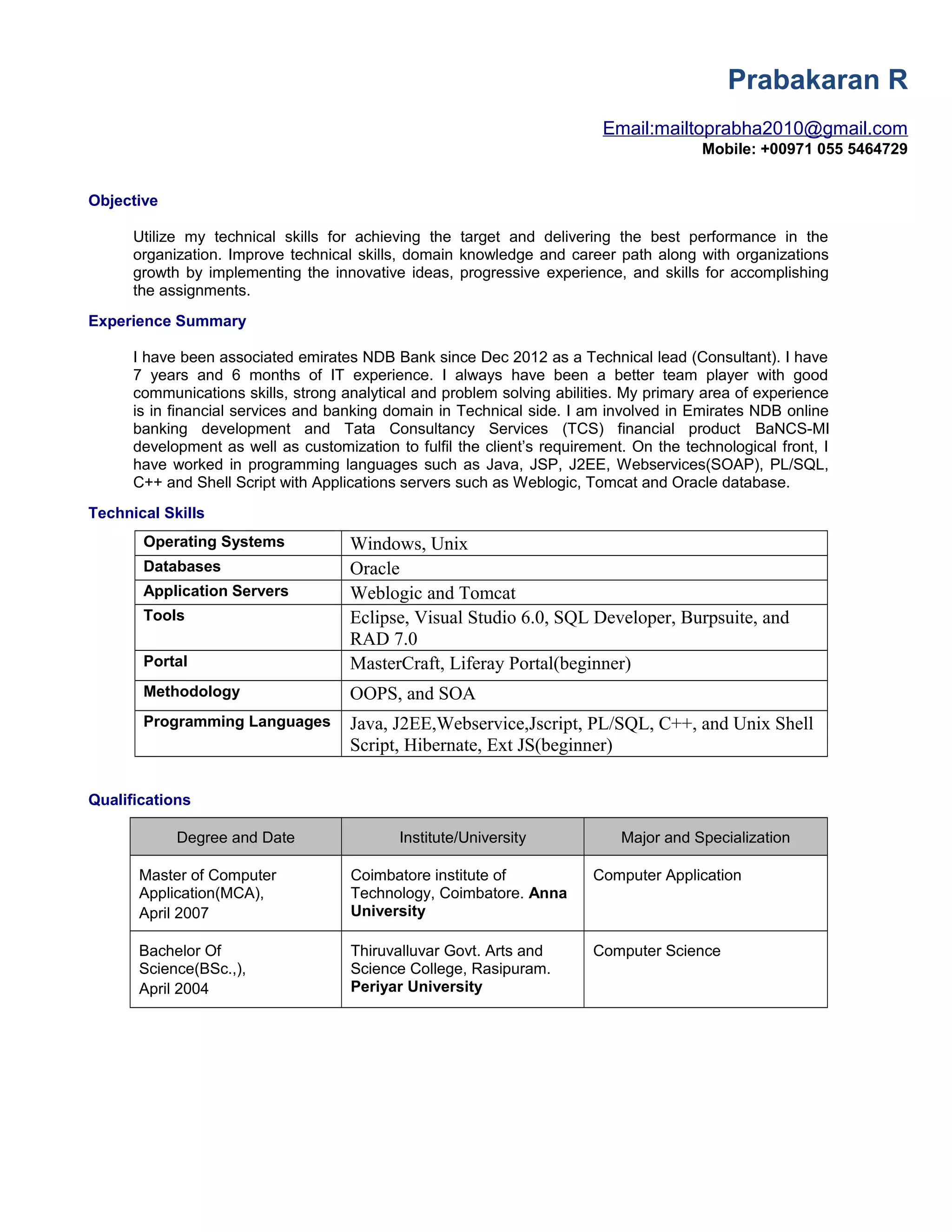 Prabakaran R has over 7 years of experience as a technical lead and senior software engineer working on banking projects. He has expertise in Java, J2EE, PL/SQL, and other technologies. Some of his key projects include developing the online banking system for Emirates NBD Bank and customizing the Tata Consultancy Services' BaNCS financial software. He is looking to utilize his technical skills and experience to contribute to organizational goals.
