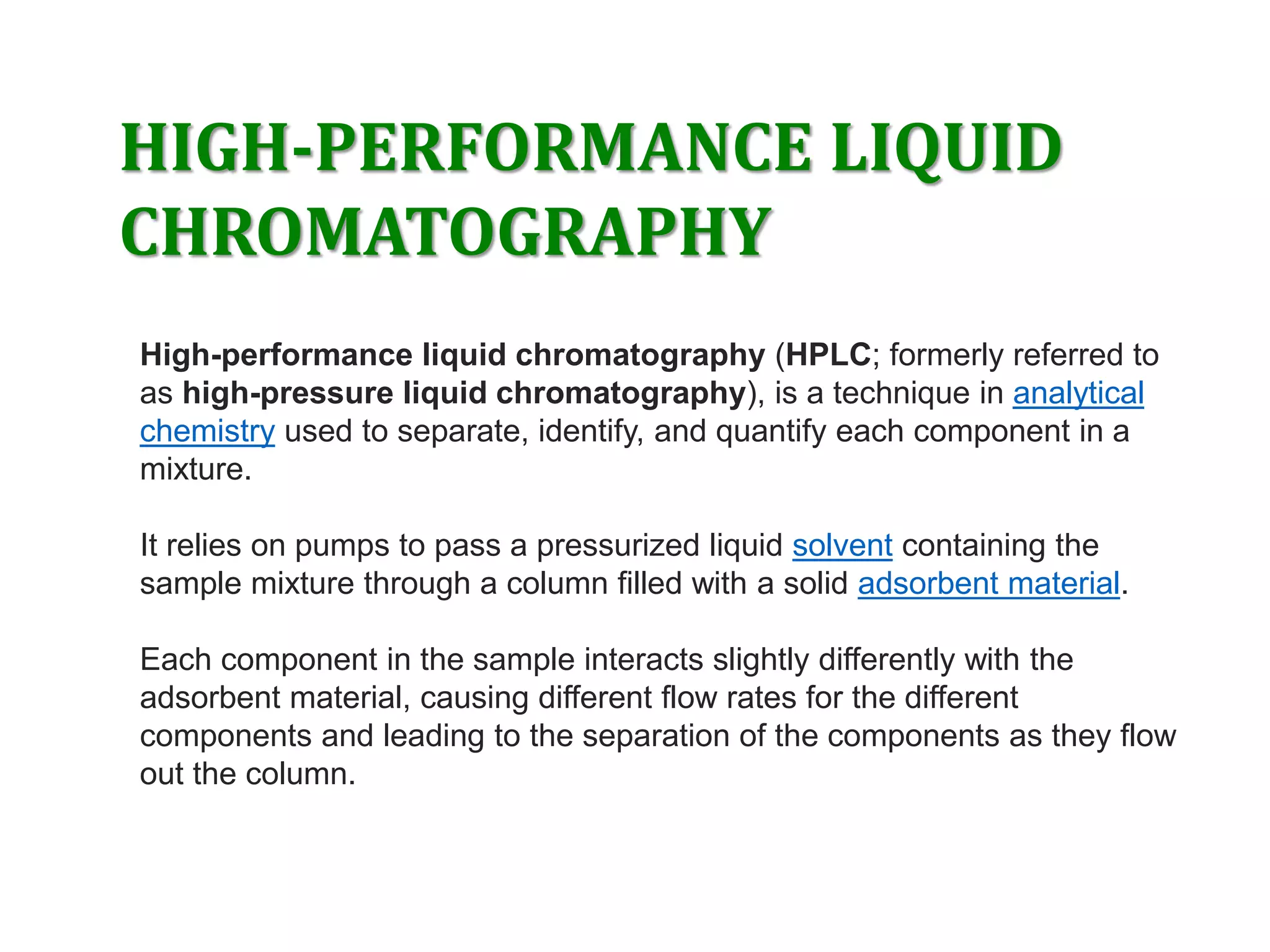This document discusses various chromatography techniques including high-performance liquid chromatography (HPLC), fast protein liquid chromatography (FPLC), ultra-performance liquid chromatography (UPLC), and rapid resolution liquid chromatography (RRLC). HPLC uses pumps to pass a pressurized liquid through a column to separate sample components. FPLC is a modified HPLC used for protein separations using aqueous buffers and resins. UPLC uses smaller particle columns (<2μm) than HPLC to improve resolution, speed, and sensitivity. RRLC also uses sub-2μm particles and high flow rates to achieve faster analysis times than HPLC while maintaining resolution.