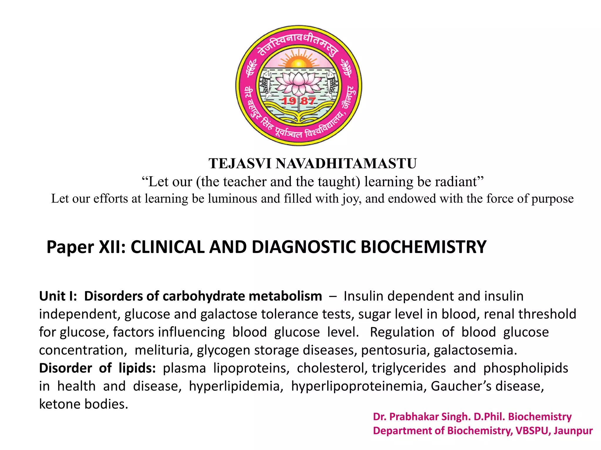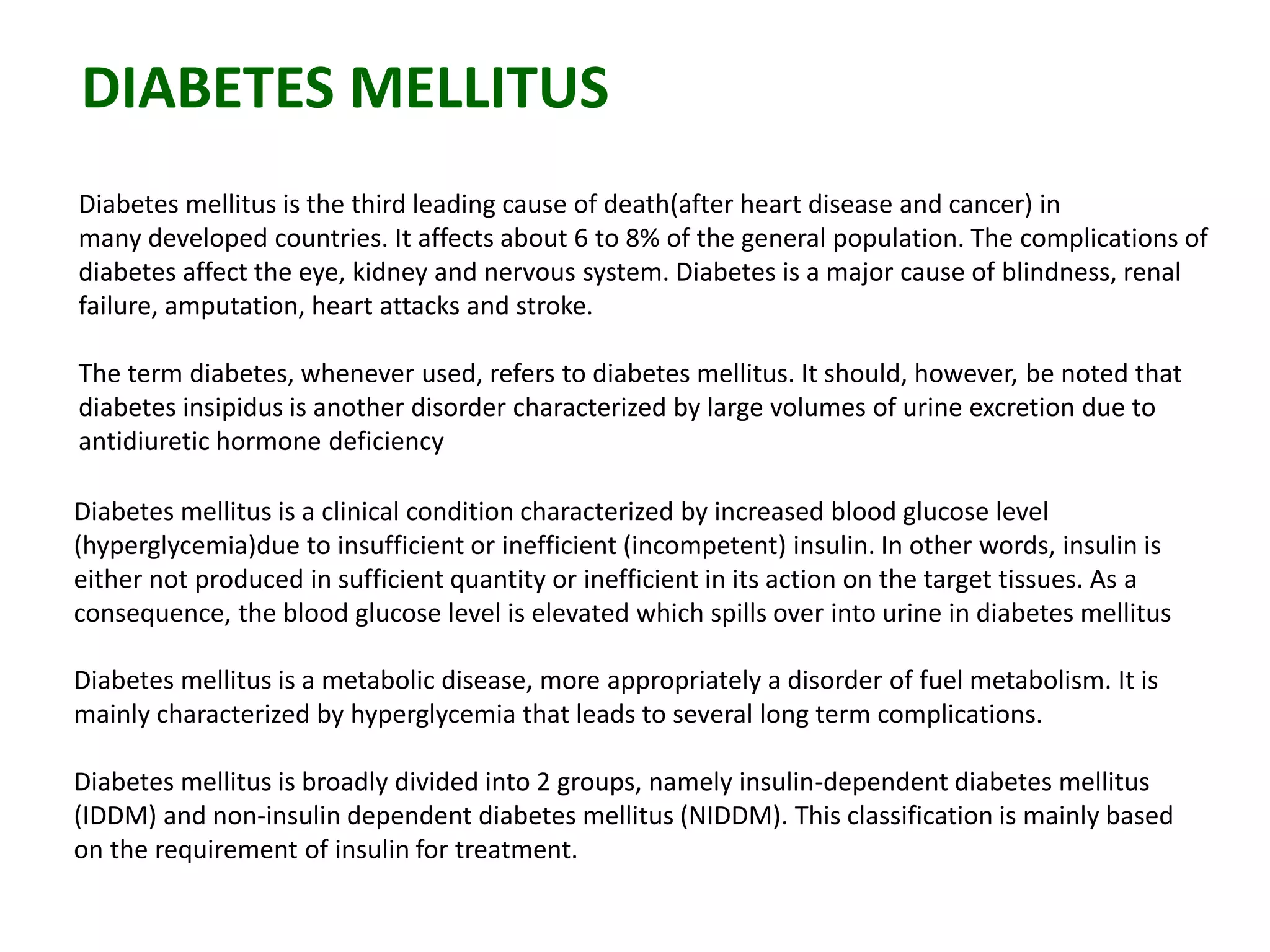 The document discusses disorders of carbohydrate and lipid metabolism. It begins by defining diabetes mellitus as a metabolic disease characterized by hyperglycemia. It then describes the two main types: insulin-dependent diabetes mellitus (IDDM), which results from destruction of insulin-producing beta cells and requires insulin treatment; and non-insulin dependent diabetes mellitus (NIDDM), which is more common and often associated with obesity. It further discusses disorders like glycogen storage diseases, pentosuria, galactosemia, and regulation of blood glucose levels. Lipid disorders like hyperlipidemia are also briefly mentioned.