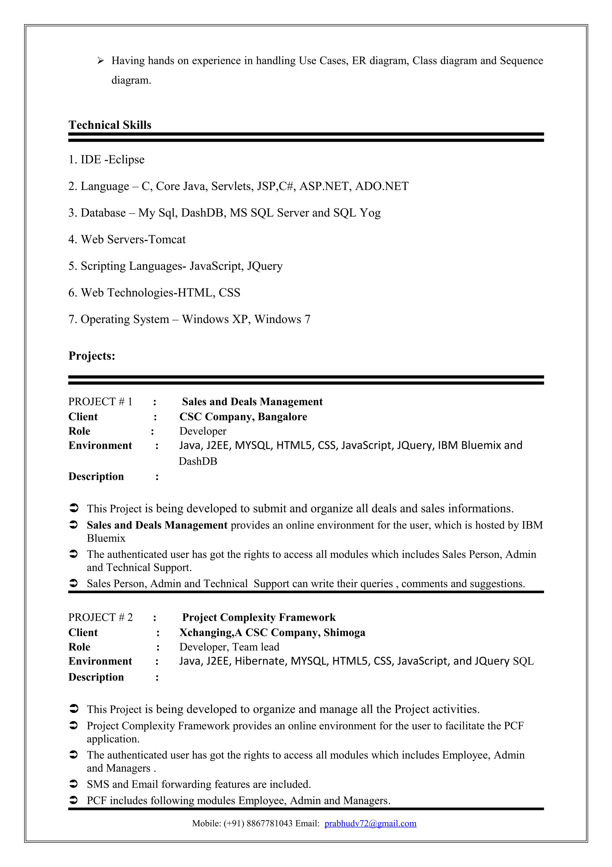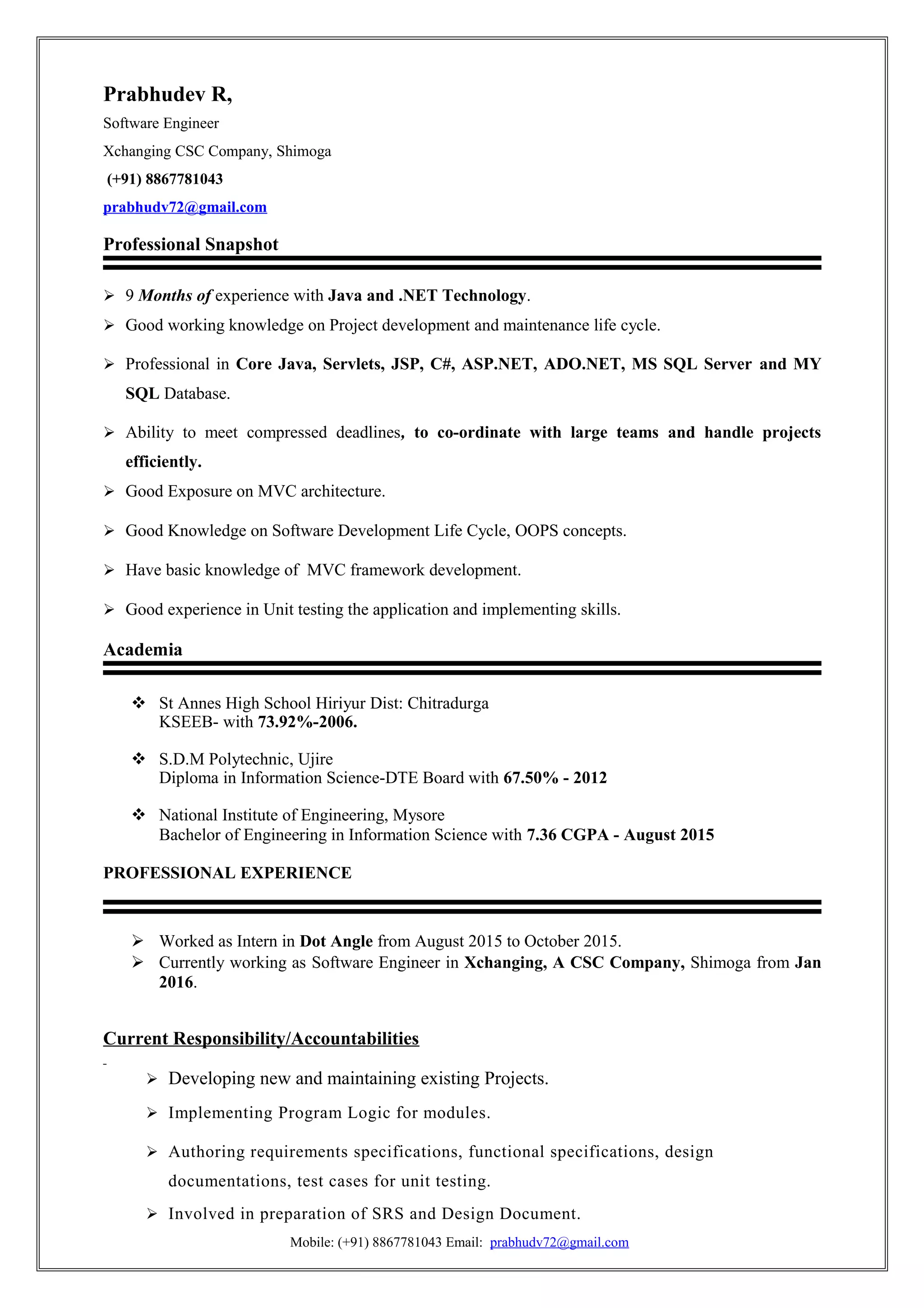 Prabhudev R is a software engineer with 9 months of experience developing projects using Java, .NET, SQL Server, and MySQL. He has experience developing web applications using technologies like Java, Servlets, JSP, C#, ASP.NET, and frameworks like MVC. He is proficient in software development processes and has experience developing projects for clients in various domains. He is certified in Java and Microsoft technologies and holds an ISTQB certification in software testing.