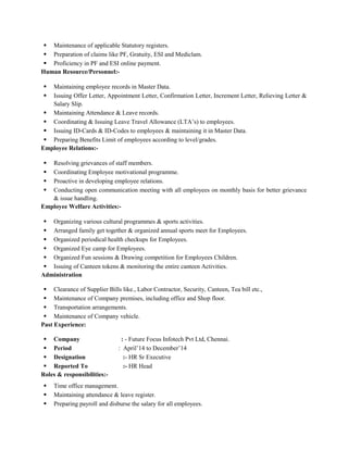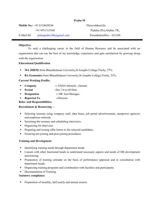 This document contains a resume for M Prabu, who is seeking a challenging career in human resources. He has over 7 years of experience in HR roles. Currently, he works as an HR Assistant Manager at GNSA Infotech in Chennai, where his responsibilities include recruitment, training, statutory compliance, personnel management, employee relations, and administration. Prabu has a MA in HRM and BA in Economics. He is proficient in MS Office, Windows operating systems, and has knowledge of payroll, statutory compliance, and welfare programs. He aims to contribute to organizational growth through his skills and experience.