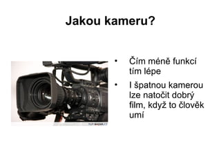 Prace s kamerou 1. 2. Jakou kameru? Čím méně funkcí tím lépe I špatnou kamerou lze natočit dobrý film, když to člověk umí 3. 4. Zoom, stativ a chůze Zoom = translokátor Přiblíží a oddálí obraz Zoom nepoužívejte!! Místo zoomování raději přijďte blíž Používejte stativ 5. Záběr základní jednotka filmu je záběr záběr má svoji velikost, délku a obsah střídejte úhly a velikosti záběrů hraný film – vycházejte ze scénáře 6. Velikost záběru VC: velký celek (ulice) C: celek (dům) PC: polocelek (lidská postava) PD: polodetail (postava od pasu nahoru) D: detail (obličej) VD: velký detail (oko) 7. Kompozice Zlatý řez Středová kompozice Lineární kompozice Barevná kompozice První a druhý plán Pyramidová kompozice 8. 9. 10. Pár dobrých rad na závěr Nebuďte líní - hledejte nejlepší úhel Přemýšlejte Točte neutrální záběry, tzv. prostřihy Dodržujte návaznost Sluchátka Nešetřete kazetami 11. Zadání úkolu Utvořte 3 skupiny Hlasujte: 1. anketa 2. fiktivní rozhovor s komiksovými postavami 3. reportáž o městě 12. Tento projekt byl realizován za finanční podpory Evropské unie. Za obsah sdělení odpovídá výlučně autor. Sdělení nereprezentuje názory Evropské komise a Evropská komise neodpovídá za použití infromací, jež jsou jejím obsahem.
