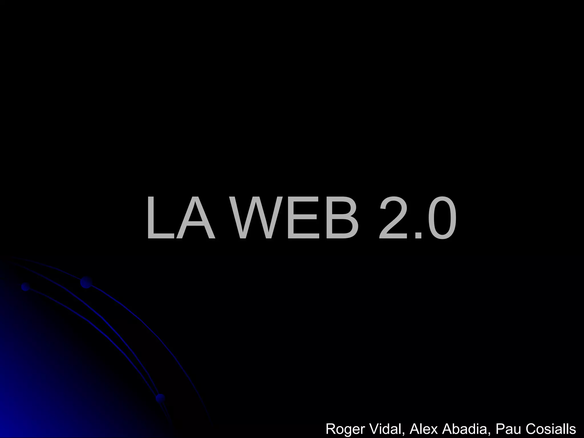 QUE ES LAWEB 2.0 ? Web 2.0 és el que la gent li diu a noves formes de mostrar o fer servir les coses a Internet. * Web 2.0 és simple : fàcil perquè qualsevol pugui publicar els seus treballs a Internet * Web 2.0 és social : fàcil per a les persones connectar-se amb altres persones * Web 2.0 està obert : fàcil per als llocs web i programes d'ordinador per a intercanviar dades amb altres fonts Per a les persones que utilitzen Internet, els wikis i els blogs són la Web 2.0. Alguns pensen que la Viquipèdia és un gran exemple de la "web 2.0". Web 2.0 és sobretot sobre els continguts generats pels usuaris i interactiu. En el fons, es basa en les tecnologies d'internet que estan en ús des de l'inici d'Internet i la WWW i li dóna una capa d'abstracció sobre prestació de bons serveis.