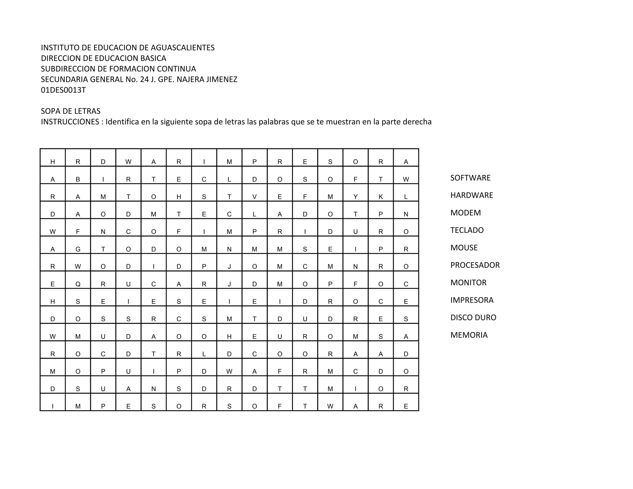 The document is a worksheet from a secondary school in Aguascalientes, Mexico that contains a word search puzzle. Students are instructed to identify words related to computers that are provided in a list on the right side of the page within the letter grid. Some of the words included in the letter grid are SOFTWARE, HARDWARE, MODEM, TECLADO, MOUSE, PROCESADOR, MONITOR, IMPRESORA, DISCO DURO, and MEMORIA.