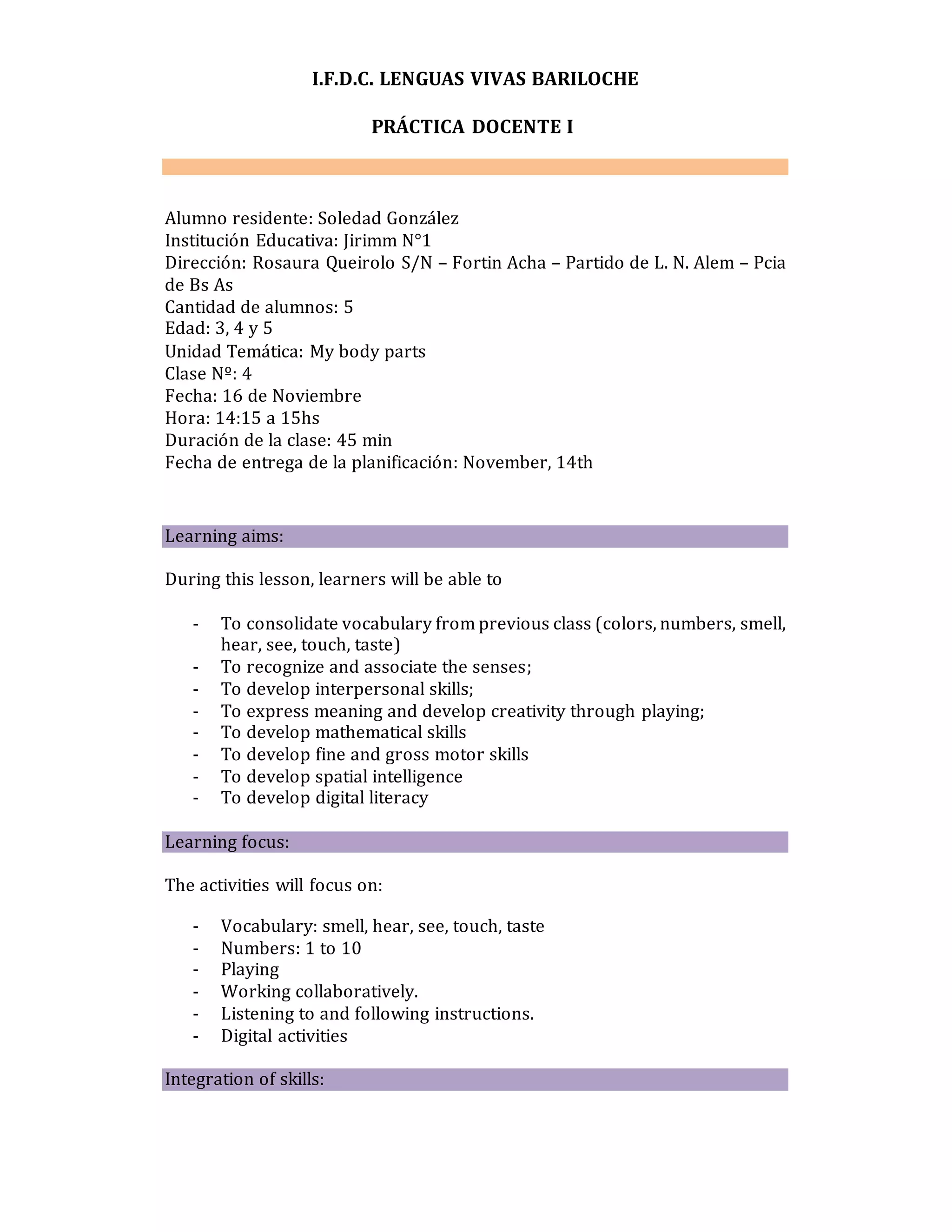 The lesson plan summarizes a 45-minute English class for 3-5 year old students focusing on body parts and senses. The class includes 3 main activities: 1) Associating body parts with senses through a worksheet, 2) Creating a "My Body" mini book by drawing and coloring body parts, and 3) A digital activity to create a monster by matching body parts. Scaffolding strategies such as modeling, asking questions, and using a puppet are included to help students understand instructions and activities. The plan aims to develop students' language, creative, motor, and digital skills through engaging hands-on learning.