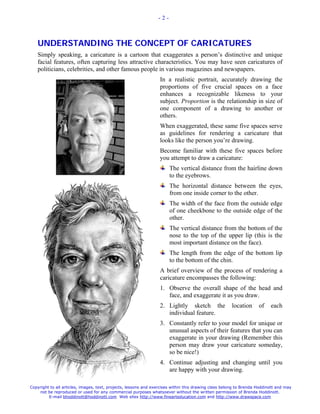 The document provides instructions for drawing a caricature within a grid format. It explains that caricatures exaggerate distinctive facial features in a fun way, unlike realistic portraits. The lesson will have students sketch a caricature of Daniel in a 4x6 grid to accurately establish proportions, then add shading lines to represent values and lighting. Key steps include outlining the subject's proportions in the grid, and adding shading lines from the dominant light source in the upper left corner.