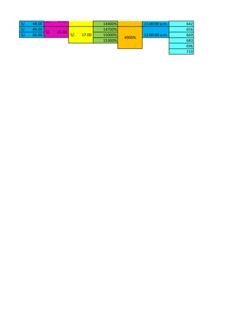 The document shows a table with 50 rows listing an increasing amount of Peruvian Sol (S/.) in the left column from S/. 1 to S/. 50. The middle column shows the interest percentage accumulated, starting at 300% and increasing up to 1500%. The right column shows the total amount including the original investment and accumulated interest at various time points from 12:00 am to 12:00 am. The interest accrues every 2 hours.