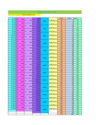 This document contains a table showing calculations of interest earned on deposits of Peruvian sol (S/.) amounts over time. The table tracks 50 deposits made in 1 sol increments from S/.1 to S/.50, with interest accruing at increasing rates from 300% to 4900% over 24 hours in hourly intervals. It displays the principal deposit amount, accumulated interest in two columns labeled SUM 1 and SUM 2, and a TOTAL column summing the principal and interest earned.
