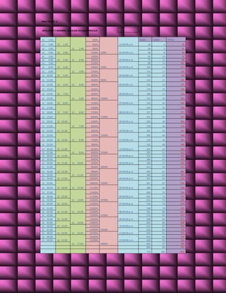 This document appears to be a student assignment containing tables and calculations. It lists amounts of money in Soles (S/.) with increasing values from S/. 1.00 to S/. 50.00. It includes calculations for sums, percentages, and totals at increasing time intervals from 12:00:00 a.m. to 12:00:00 a.m. the next day. The student's name listed is Gavilan Ayque Priscila.
