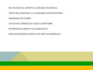 Oscar Javier Chavez Chavez entered architecture school because he is from a tourist city where he envisions great construction progress in the future. He has the example of his father who is also an architect, and some engineer friends with whom he plans to create an enormous constructive engineering group in general. His hobbies include sports like baseball, topics related to large constructions, design programs, going out for fun, training in fields and gyms, and drawing small sketches of general objects.