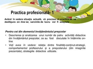 Documentul abordează practica profesională în învățământul preșcolar pentru anul universitar 2019-2020, inclusiv analiza activităților didactice desfășurate online. Studenții sunt încurajați să participe activ, să elaboreze proiecte de activitate și să folosească materiale didactice adaptate. De asemenea, se subliniază importanța colaborării cu familiile și modul în care amenajarea spațiului educațional contribuie la calitatea actului educațional.