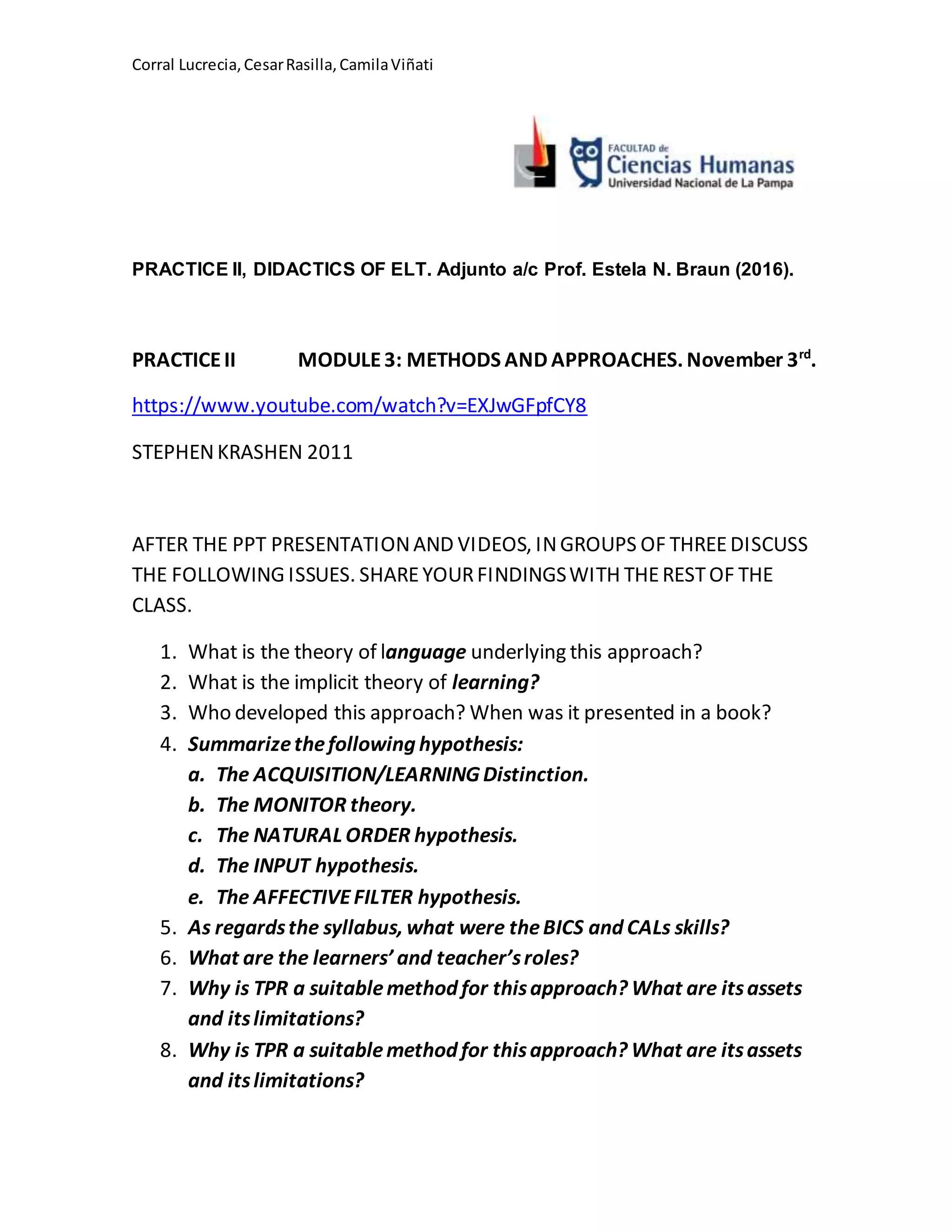 The document discusses the Natural Approach developed by Tracy Terrell and Stephen Krashen. Some key points: