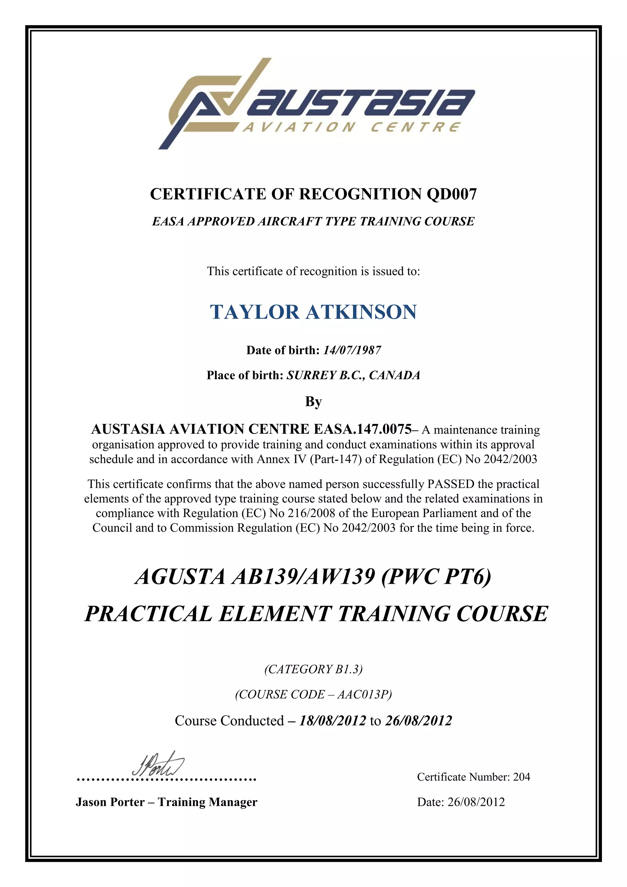 Taylor Atkinson, born in 1987 in Surrey, B.C., Canada, received a certificate of recognition from Austasia Aviation Centre for successfully completing their EASA-approved aircraft type training course for the Agusta AB139/AW139 (PWC PT6) helicopter. The practical element training course, conducted from August 18-26, 2012, was in compliance with European aviation regulations and certified Taylor's skills in category B1.3 maintenance.