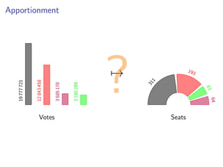 The document discusses practical and worst-case efficient apportionment algorithms developed by Raphael Reitzig and Sebastian Wild, focusing on divisor methods for allocating seats based on votes from multiple parties. It outlines various apportionment wishes like pairwise vote monotonicity and house monotonicity, as well as details computational methods for implementing these algorithms. Additionally, it includes runtime analysis and references to related literature on the topic.
