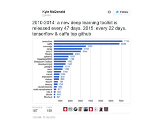 The document discusses practical approaches to deep learning. It recommends starting with pre-trained models and web APIs before training your own models. It describes popular deep learning frameworks like Caffe and Keras that can be used to fine-tune pre-trained models or train new models. It also discusses designing custom model architectures and layers in TensorFlow using its computational graph approach and automatic differentiation.