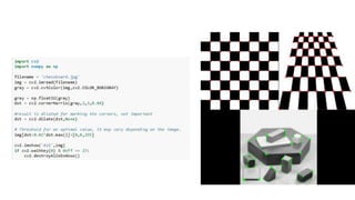 This document provides an overview of various computer vision and image processing techniques including template matching, Hough transforms, image segmentation using watershed algorithms, feature detection using Harris corner detection. It outlines the stages of an assignment involving implementing and comparing Hough line and circle transforms, Harris corner detection and JPEG compression with OpenCV. It also describes a final group project to solve a real-world problem using computer vision techniques and building a mobile application.