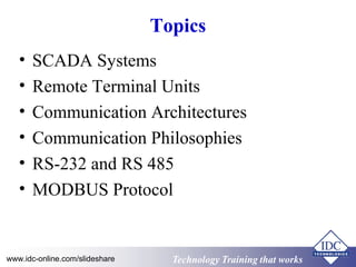 The document provides an overview of SCADA (Supervisory Control and Data Acquisition) systems, detailing the architecture, remote terminal units (RTUs), communication protocols, including Modbus, and hardware components involved. It explains the functionalities of different system components, communication methods, and the significance of protocols for industrial applications. The document emphasizes the importance of understanding these technologies for effective implementation and operation in remote data acquisition and control systems.