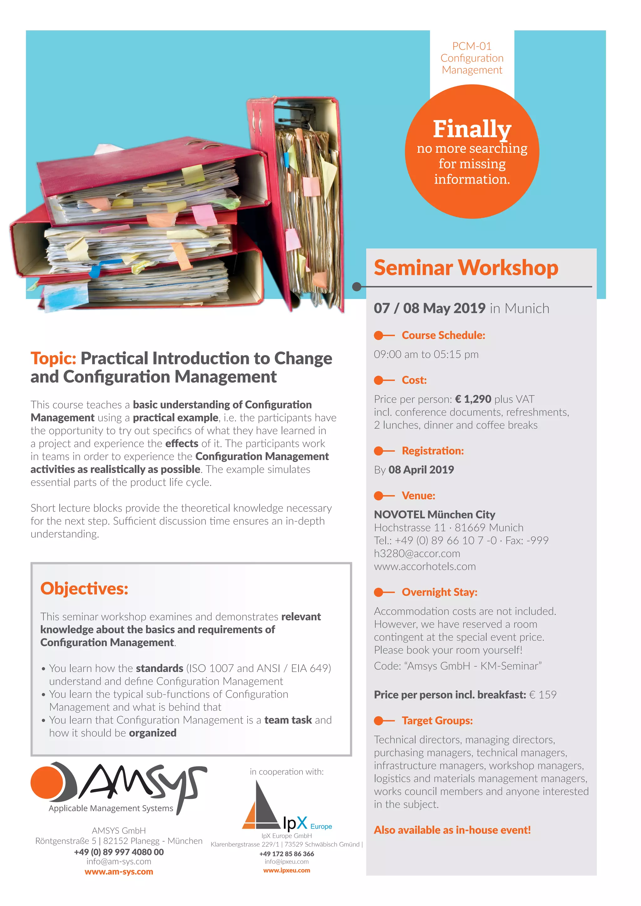 The document outlines a seminar workshop on configuration management hosted by AMSYS GmbH in Munich on May 7-8, 2019, aimed at various management professionals. The course includes theoretical knowledge and practical exercises on configuration management, covering key topics and standards, and costs €1,290 per participant, with accommodation available at a special rate. Registration is required by April 8, 2019, and various cancellation policies are stated.