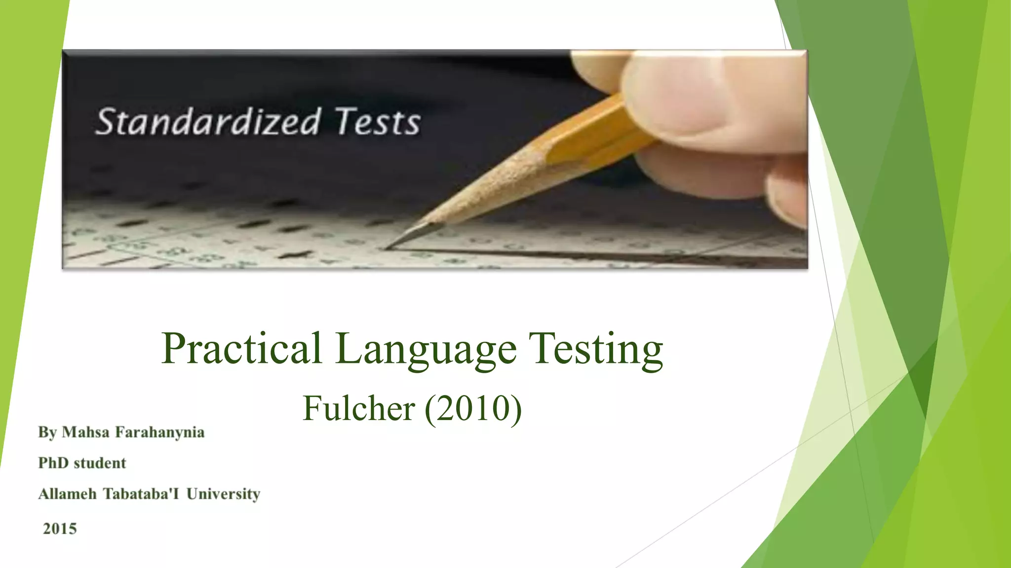 This document discusses key concepts in language testing and standardized tests. It covers two testing paradigms: norm-referenced testing which compares test takers to a group, and criterion-referenced testing which evaluates if a criterion is met. The document also defines standardized tests, explores why testing is viewed as a science, and examines concepts like central tendency, dispersion, reliability, and ways to calculate reliability such as using correlations and item analysis.