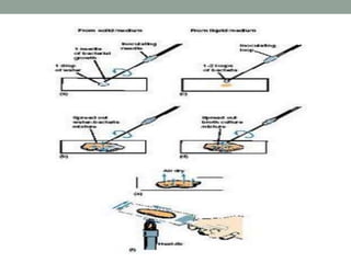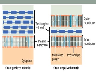 Gram's stain is a method used to differentiate between two large groups of bacteria - Gram positive and Gram negative - based on their cell wall structure and composition. The staining process involves smearing a bacterial sample on a slide, treating it with crystal violet dye and iodine, then decolorizing it with alcohol or acetone before counterstaining with safranin. This allows bacteria to be classified based on whether they retain the primary violet stain (Gram positive) or take up the counterstain (Gram negative).