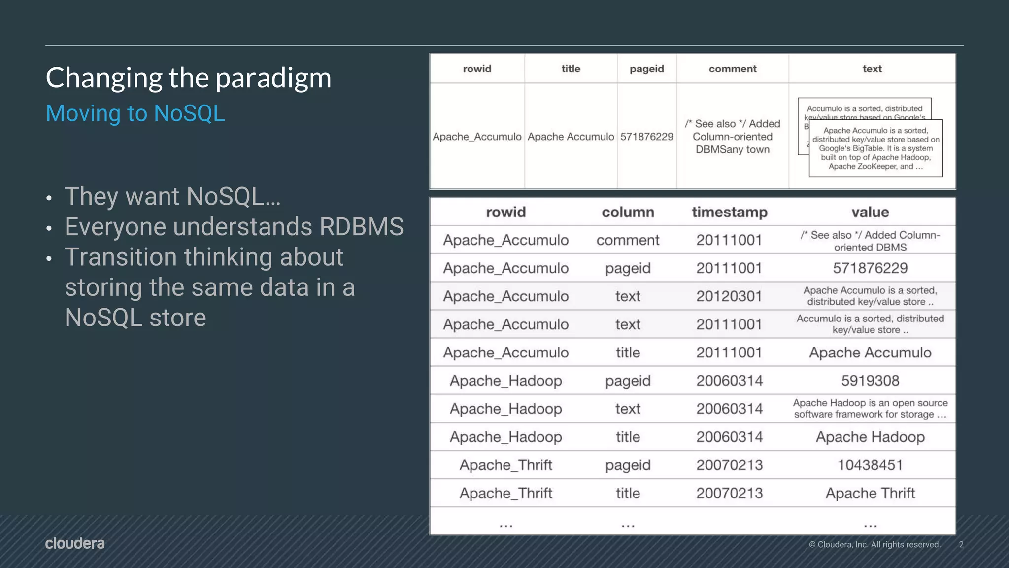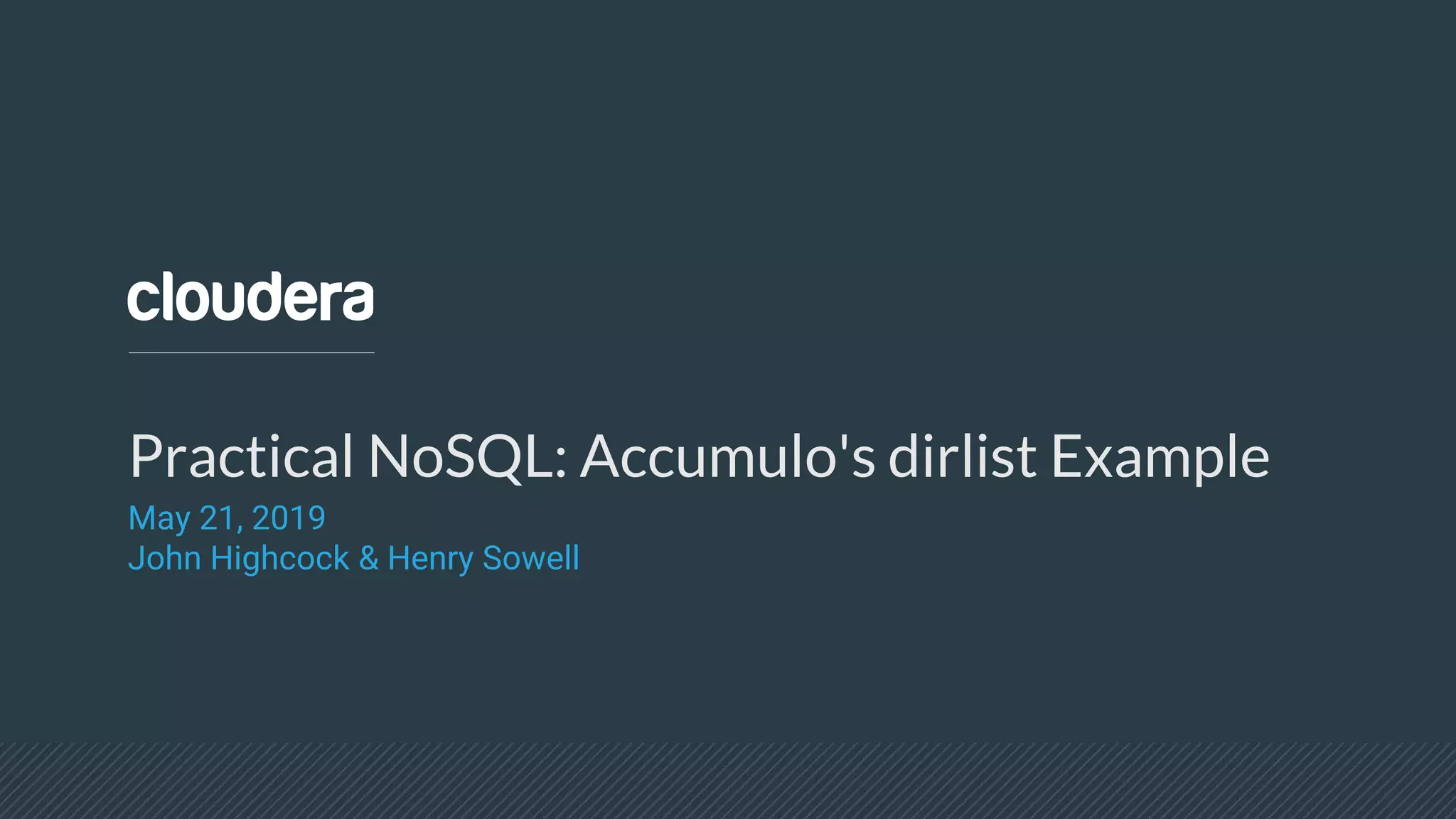 The document discusses the use of Apache Accumulo for managing filesystem-like structures in a NoSQL context, highlighting its scalability and efficiency in handling numerous small files. It outlines the setup process, including file ingestion, table creation, and differing authorizations, while presenting examples of data representation within Accumulo. Additionally, it features functionalities such as querying capabilities and a simple viewer for navigating file metadata and content.