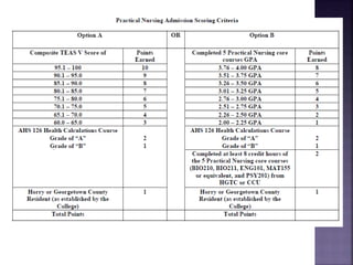 The Practical Nursing diploma program at HGTC is a 3 semester program with accelerated 8-week courses. There are two options for applying: Option A involves scoring 60 or higher on the TEAS test and meeting other criteria. Option B involves completing 5 prerequisite courses with a 2.0 GPA and grades of C or higher within required time limits. Applicants must submit transcripts, pay a $30 fee, and complete a background check affidavit. The 80 applicants with the highest number of points based on TEAS scores, grades, and other factors will be accepted into the program each year.