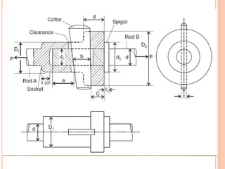 The document provides the step-by-step process for designing a cotter joint to connect two steel rods subjected to an axial tensile force. It involves selecting the material (plain carbon steel), selecting a factor of safety of 6 for the rods and ends and 4 for the cotter, calculating permissible stresses, and designing the spigot, socket, and cotter dimensions based on equations considering failure by tension, crushing, shear, and bending. The key dimensions designed and specified are the diameters of the rod, spigot, socket ends and collars, thicknesses of the spigot and socket collars, length and width of the cotter.