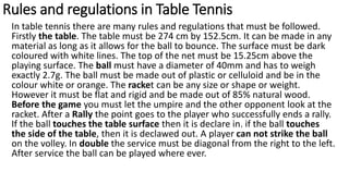 The document provides information on the rules, regulations, techniques and tactics of table tennis. It discusses: