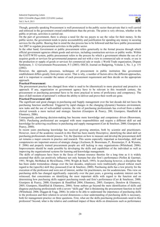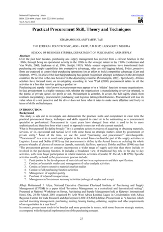 This document discusses practical procurement skills and techniques. It begins by providing background on how procurement has evolved from a clerical function to a more strategic role. It then defines procurement as encompassing the full supply chain from contracts to purchasing to logistics. The document outlines specific activities included in the procurement process and discusses how procurement approaches differ between public and private sectors. It emphasizes that procurement professionals must have practical skills and competencies to be effective in their roles.