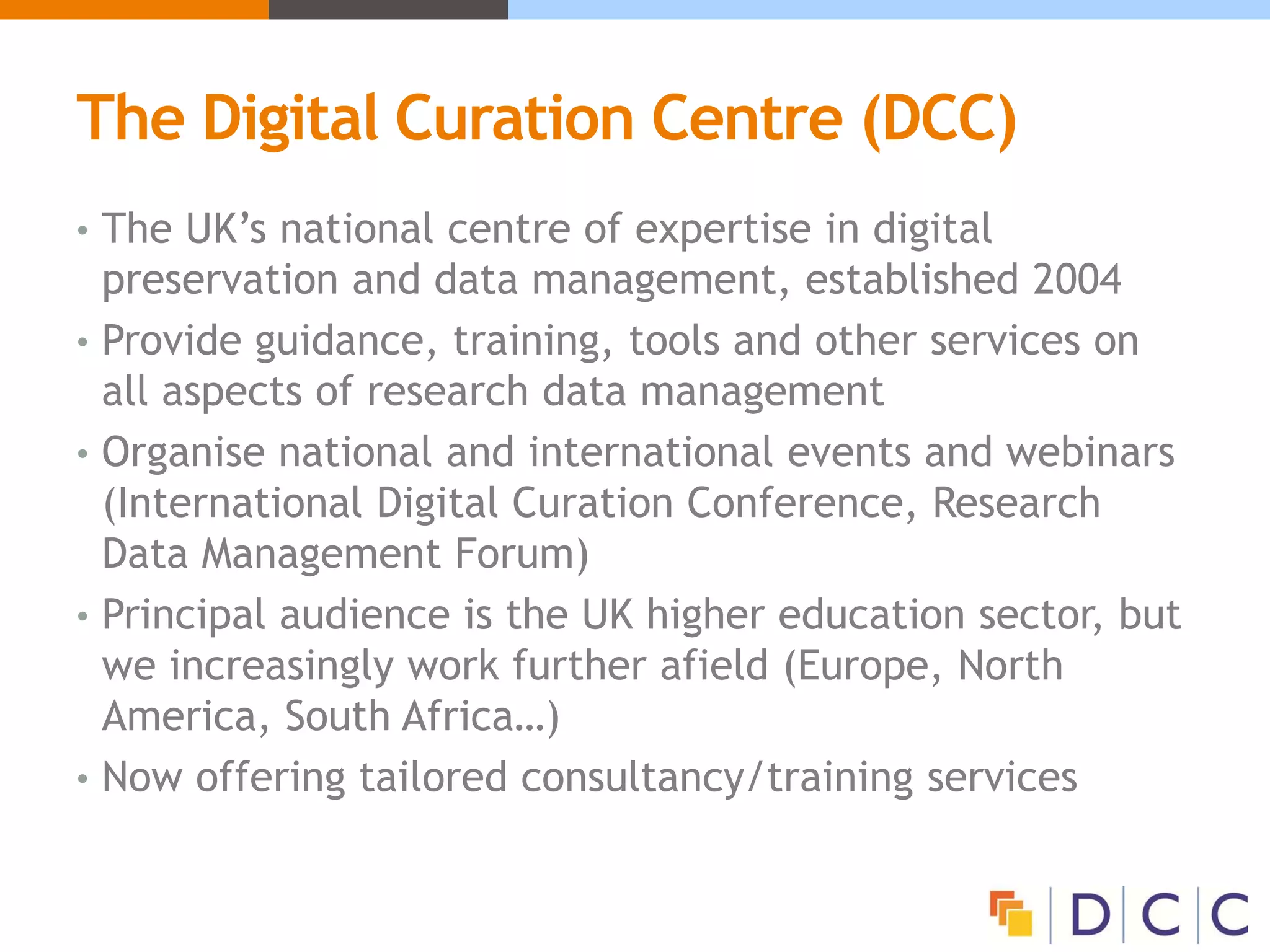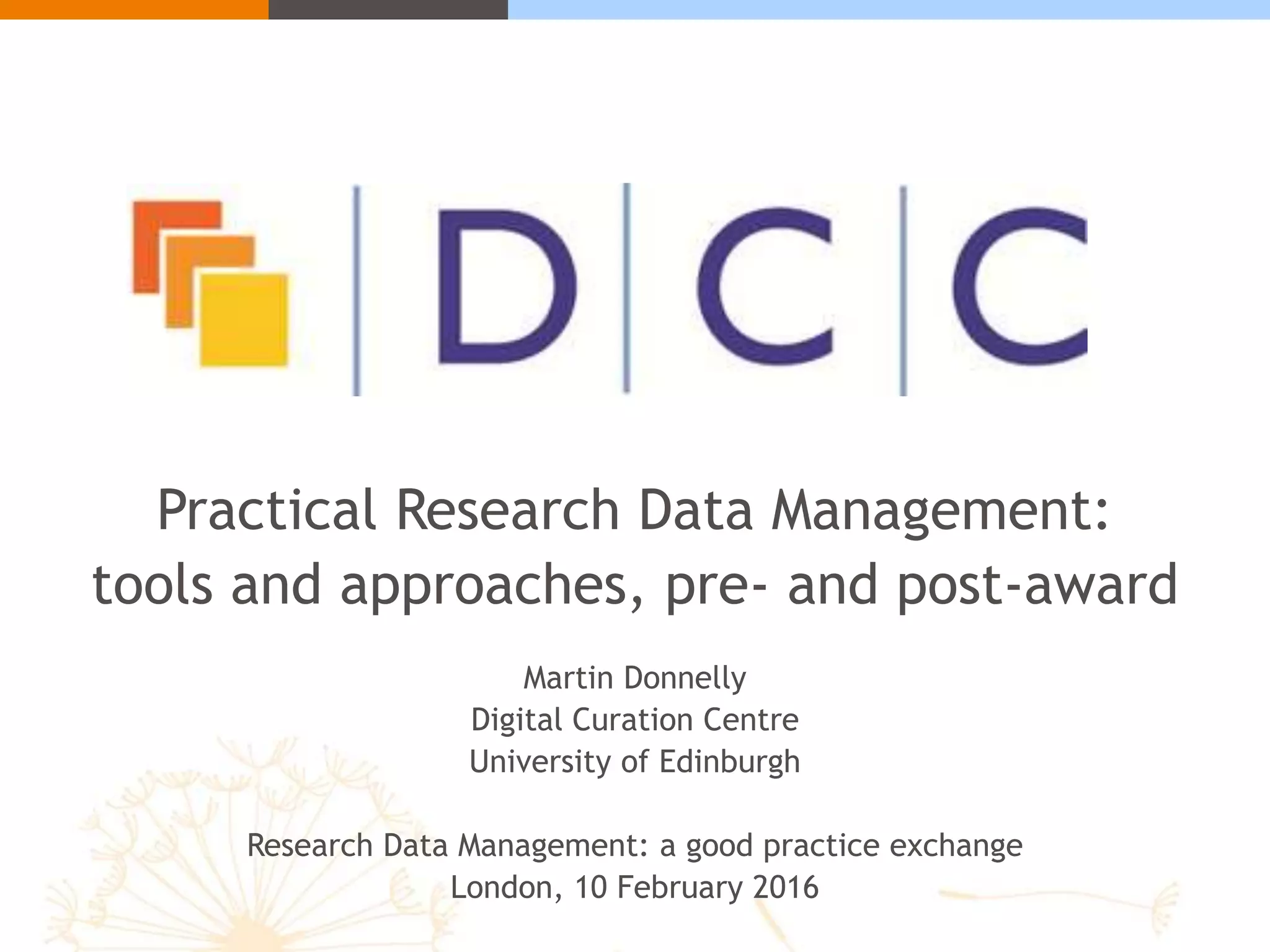 This document provides an overview of a presentation on practical research data management. It discusses the importance of research data management, who is involved in the process, and the benefits it provides, such as increased efficiency and accessibility of data. It emphasizes that data management planning is a shared activity that should involve researchers, support staff, and other stakeholders. Effective data management planning helps ensure data is organized, documented, preserved, and shared appropriately. The presentation also provides examples of what a data management plan may include and why creating one is important for collaborative research projects.