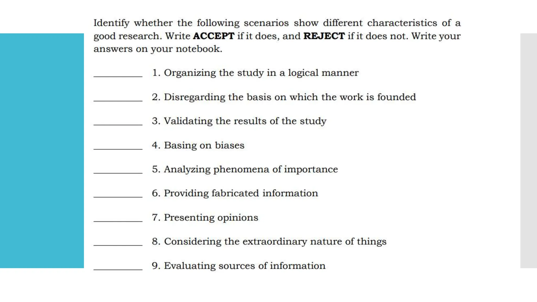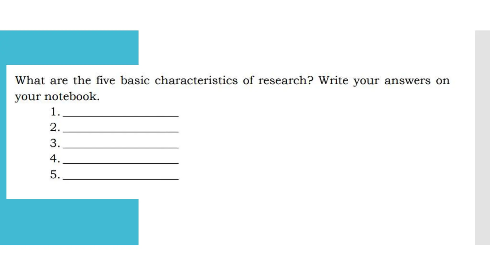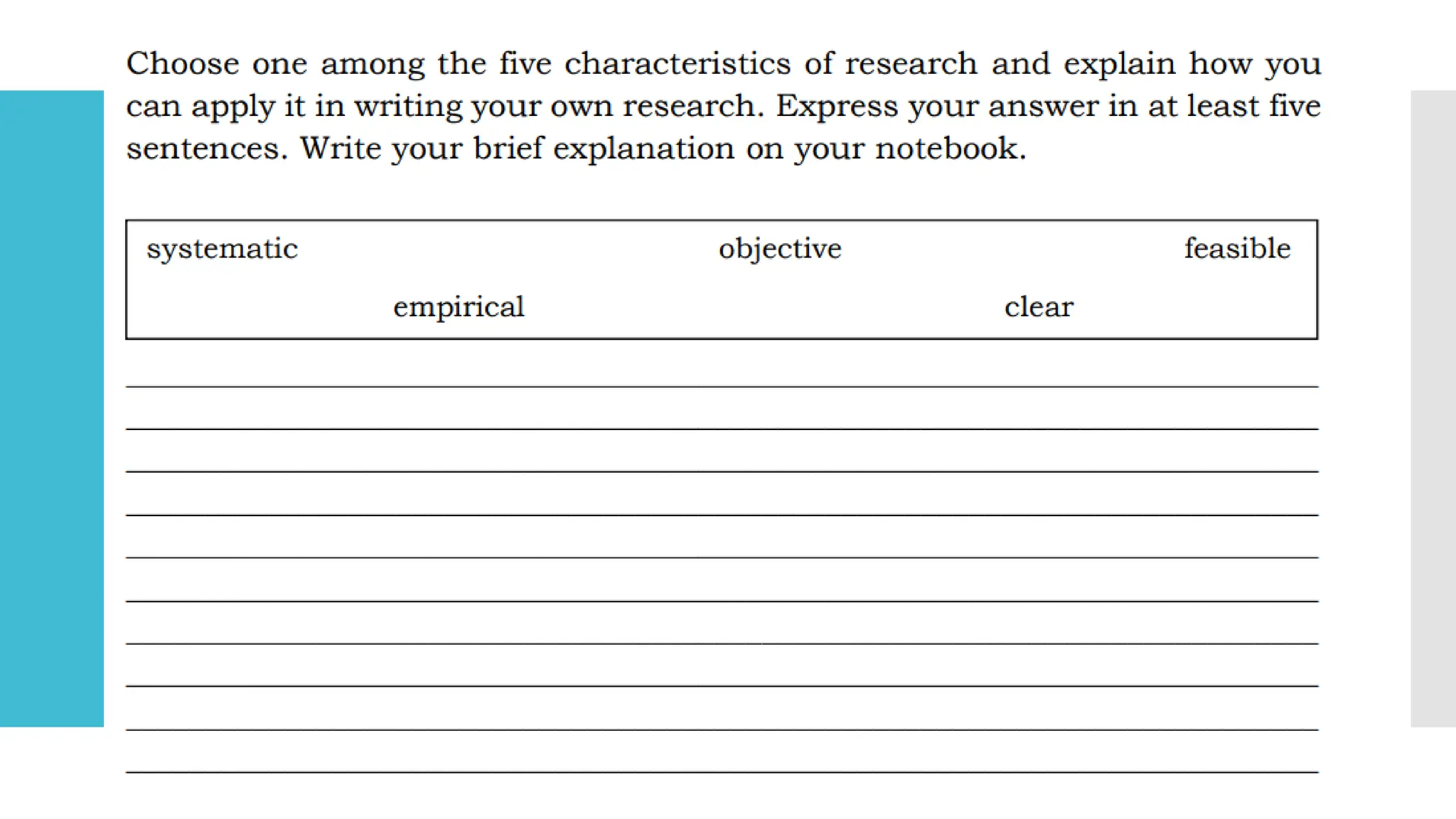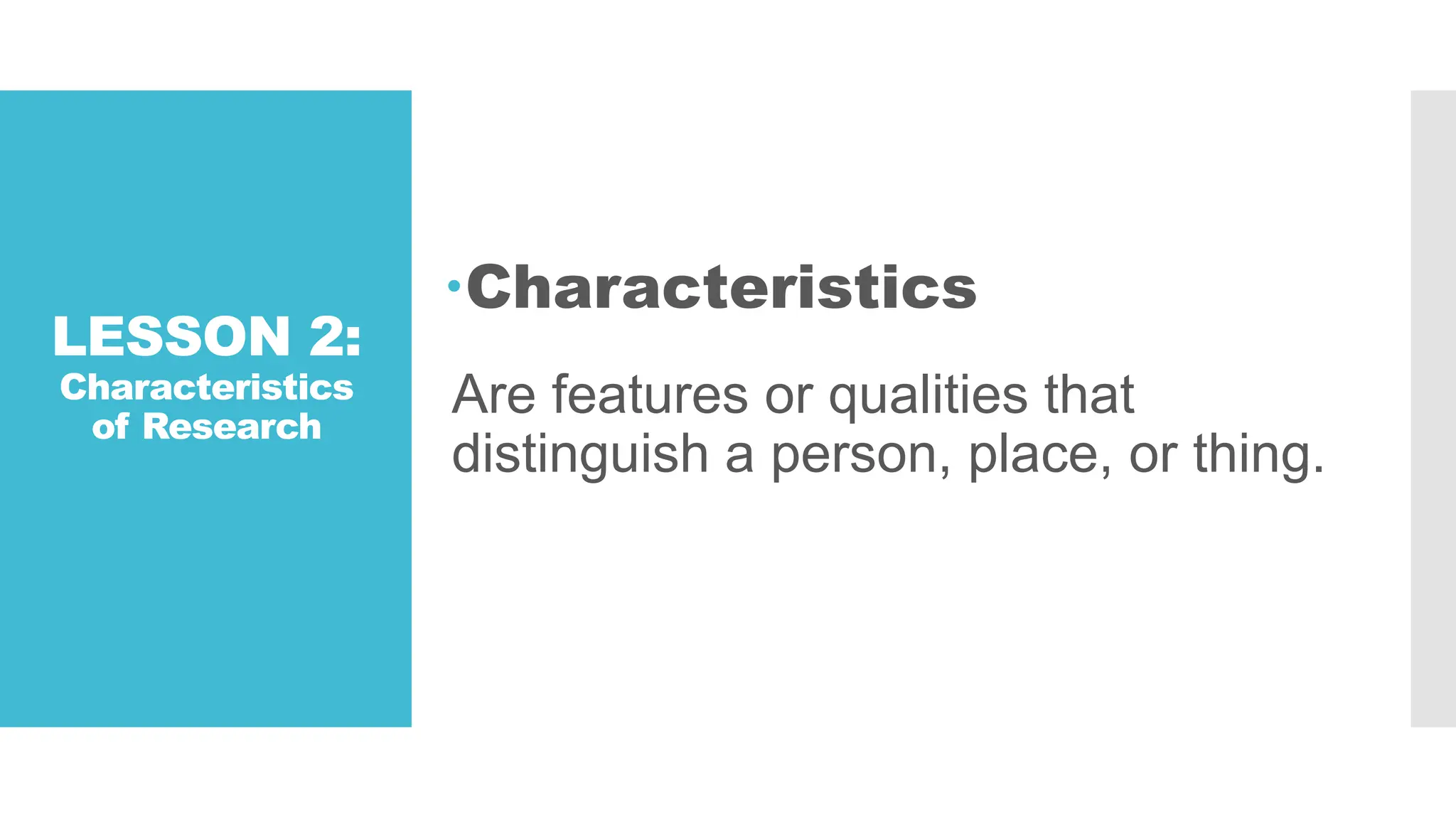 The document outlines the key characteristics and process of research. It identifies 5 main characteristics of research: 1) it should be systematic, 2) objective, 3) feasible, 4) empirical, and 5) clear. It then describes the typical research process as having 5 phases: problem identification, literature review, hypothesis formulation, research design, data collection/analysis, and reporting results. Finally, it lists the 7 main steps in the research process as defining the problem, reviewing literature, formulating hypotheses, preparing a design, collecting data, analyzing data, and reporting findings.