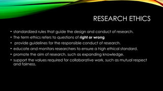 Research ethics consist of standardized rules guiding the design and conduct of research, focusing on the principles of right and wrong. They aim to promote responsible research practices, ensure high ethical standards, and support collaborative values. Key ethical principles include honesty, objectivity, integrity, carefulness, and respect for confidentiality and intellectual property.