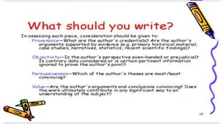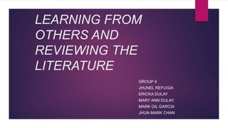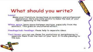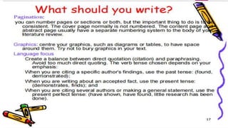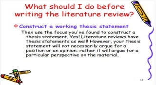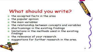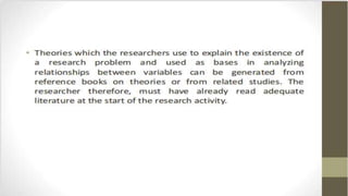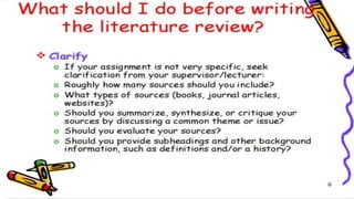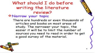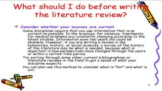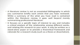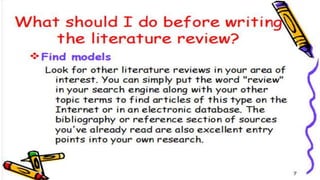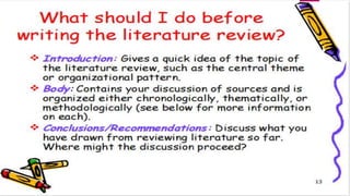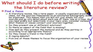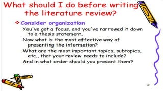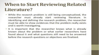 The document discusses the importance and methods of reviewing related literature (RRL) in research, highlighting its role in understanding existing knowledge and theories related to a research topic. It outlines the traditional and systematic approaches to RRL, detailing stages from searching for literature to writing analyses, and emphasizes the significance of proper citation to avoid plagiarism. It distinguishes between local and foreign literature and provides guidelines for conducting an effective literature review.