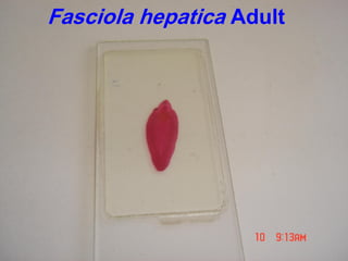 This document provides a summary and slides of various parasites important in medical parasitology. It includes images of adult parasites such as Fasciola hepatica and Fasciola gigantica, parasite eggs, larval stages, and life cycles. Parasites featured include those that cause schistosomiasis, cysticercosis, hymenolepiasis, diphyllobothriasis, echinococcosis, ascariasis, trichuriasis, enterobiasis, hookworm infection, trichinosis, filariasis, and onchocerciasis.