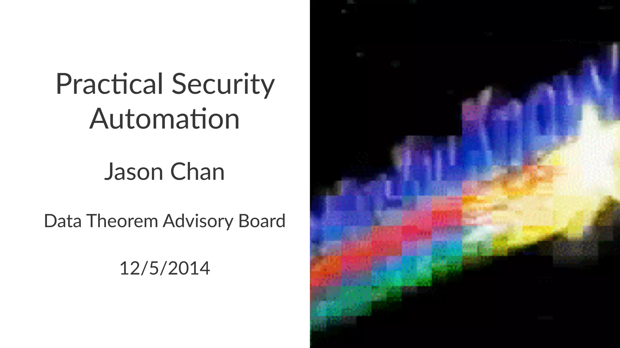 This document discusses various techniques for improving security automation and visibility, including discovering and inventorying assets, prioritizing risks, performing multi-layer security testing, monitoring configurations, discovering and handling security intelligence, and refining security signals and response. Key recommendations include tailoring discovery to the rate of change, considering data normalization, using risk prioritization as an input not a law, avoiding certain conversations, leveraging security testing pyramids, recognizing a continuum of configuration safety, developing an intelligence taxonomy, and starting small with signal refinement and response automation.