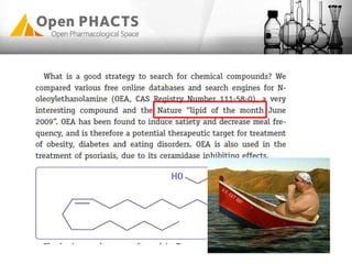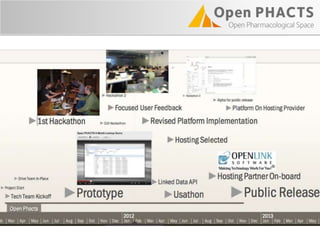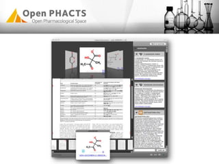 The Open PHACTS project aims to create a semantic integration hub to enhance drug discovery in the pharmaceutical industry, addressing the challenge of disparate and variable-quality scientific data. It involves collaboration among academic and industry partners to develop standardized tools for data integration, access, and analysis. Key focuses include effective knowledge management, innovative informatics tools, and establishing a sustainable community ecosystem for ongoing contributions in pharmaceutical research.